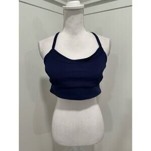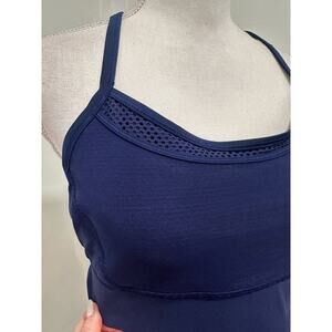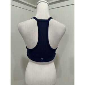 EUC Lululemon Sports Bra Size 10. This is way too big on my size 4 mannequin and will obviously be fitted on a right sized person. Navy blue. Double layer of fabric. Pockets for pads but pads are not included.