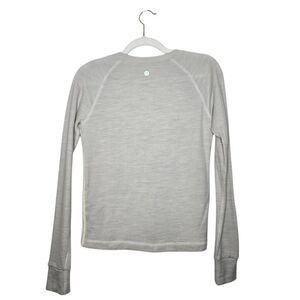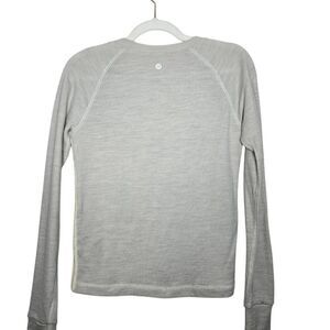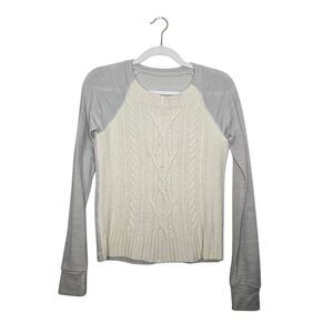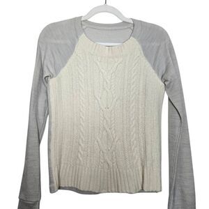 Elevate your athleisure wardrobe with this stylish Lululemon cable knit sweater. Featuring a cream white body with intricate cable detailing and contrasting light grey sleeves, this pullover blends warmth and stretch for cozy comfort without sacrificing mobility. Great for layering post-workout or for casual wear.
