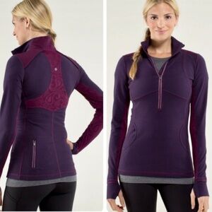 Lululemon Star Stunner Hyper Purple Lace Pullover. Size 4. Purple and blue striped pullover top with paisley lace details on the back and arms. Reflective details for safety. Zippered pocket in back. Hidden pocket inside the hand pocket in front. Thumb holes. Sleeve cuffs fill down to cover hands if needed. Designed for running but is also great for lounging and running errands. Made of breathable moisture wicking material.