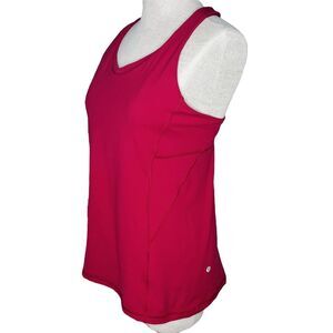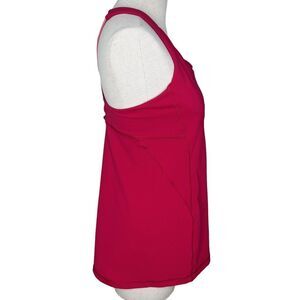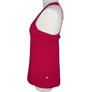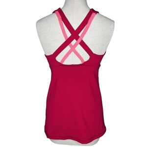 Lululemon Stash N Run Tank, size 10. In very good overall condition with minor wash wear! Tearaway tag is present but has been cut short. This colorway is Ruby Red / Glossy (red with pink accents on strappy back). This sweat-wicking tank is made with four-way stretch in Luxtreme fabric and engineered not to shrink. Made for a tight fit that lets you move without restriction. High neck front has multiple layers in the chest area to stash small items. Made to provide medium support for a B/C cup. Great for a run, the gym, or just hanging out.