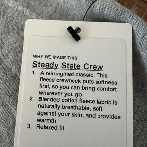 Brand new with tags Lululemon Mens Medium Steady State Crewneck Sweatshirt Gray Fleece Lined Athleisure. Sold out online in this color. Perfect condition. Relaxed fit. Super soft fleece lining. See pics for measurements. From a smoke free/pet free home.