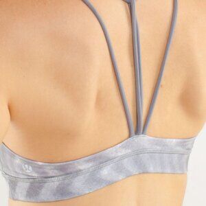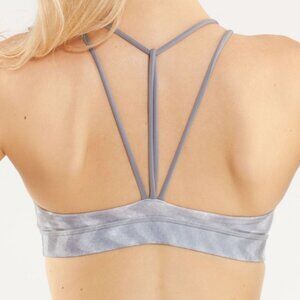 Beautiful gray tonal chevron print with a contrasting tan chevron lining. Crisscross straps, medium support, and soft, comfortable fabric—perfect for yoga, Pilates, or everyday wear.