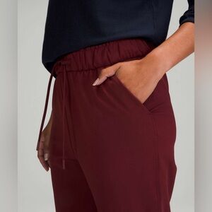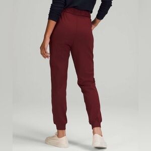Super cute deep red full length jogger pants from Lululemon. Pull tag removed but size dot is pictured- size 4! In great preowned condition; no visible flaws.