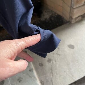 Lululemon Stripe Inkwell Blue and Green Jacket Size 4-6. Blue with emerald, green stripes, full closure, zipper kangaroo, zipped pockets, rolled cuffed mittens with thumb holes. Fabric wicks. Sweat away from post practice. Skin approximate measurements.