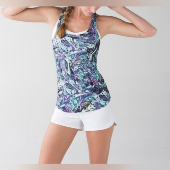 Lululemon Studio Racerback Tank Top in green/purple print combo. Pre-owned. Very good condition.
