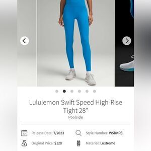 Lululemon Swift Speed High Rise Running 28” Poolside Turqoise Size 2. In great condition and perfect for running, especially in the evenings because of the reflective dots on each leg. Enjoy!