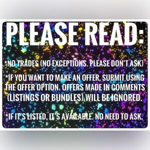 NO TRADES. If item is listed, it is available. Please submit offers using the offer button. Offers in comments will be ignored. Making comments on the price will result in member being blocked.