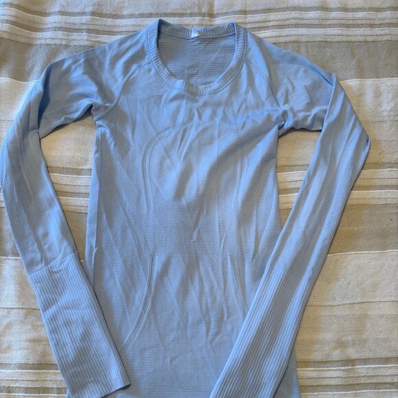 Lululemon, Swiftly Tech, long sleeve shirt, workout top, running top, athletic top, breathable, compression, periwinkle, light blue, zip pockets, XS, size 2, fitness, gym, activewear, layer