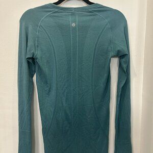100% authentic Lululemon Swiftly Tech long sleeve shirt in size 6. Pre-owned excellent condition. Hip length. Dark teal color. Has thumbholes.