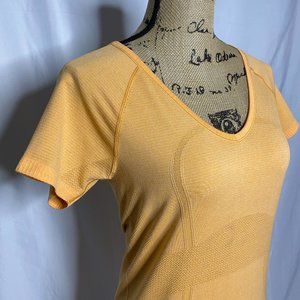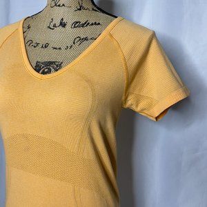 Lululemon Swiftly Tech top / t shirt. Short sleeves. Scoop v neck. Orange color. Vented. Stretch. Logo at back. Size 8. Approx measurements while flat- pit to pit: 16.5", length: 27"