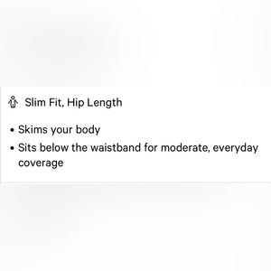 Lightweight, seamless, slim fit that hits at hip. Like new, very good preowned condition.