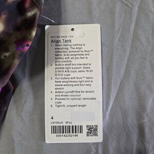 The Lululemon Sz 4 Women's Multi Splatter Green Align Tank Top is a stylish and functional activewear piece perfect for various performance activities like yoga, cycling, and running. This tank top features a wide strap design, pullover closure, and medium support level, making it comfortable and supportive while working out. The multicolor splatter design adds a fun and vibrant touch, while the stretch fabric ensures a flexible and comfortable fit. With its outdoor and sports-themed style, this tank top from lululemon athletica is a versatile addition