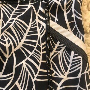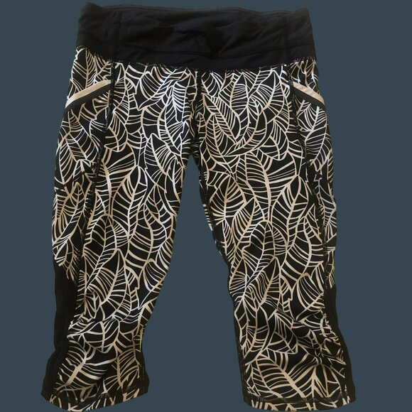 Stylish Lululemon Capri workout leggings in size 8 with a black and white leaf print design. Features leg pockets and a back zip pocket for added convenience during workouts.