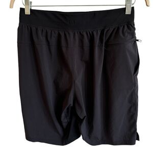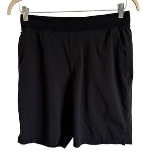 Black casual activewear shorts from Lululemon. Size Medium. The drawstring is flawed (one side is cut) but the waist is elasticized so these work just fine without the drawstring.