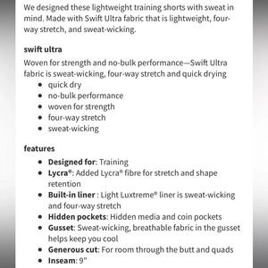 We designed these lightweight, linerless training shorts with sweat in mind. Made with Swift Ultra fabric that is lightweight, four-way stretch, and sweat-wicking.