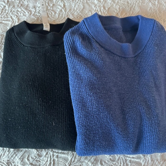 One black and one blue Lululemon sweater with wool blend. Size 8. Small split on sides. Fits boxy and roomy. Comfortable design and great for crisp weather! Selling together.