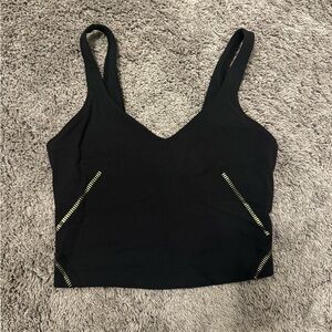 Great condition lululemon black tank with built in bra and gold accents. Size 6.