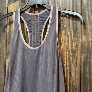 Lululemon brand tank top. Size 4. Grey. Scoop neck. Ruffle details. Ruched back. Stretch material. Drawstring hem for adjustable fit. Side pocket. Racerback style. Activewear. Great for workouts / gym / running / lounging. Moisture wicking. Preloved. Please see all photos for condition.