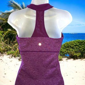 Scoop neck bra tank top by Lululemon. Cool racer back panel is see through mesh. The bra portion can hold cups but cups are not included. I don't know official color name -