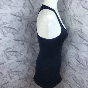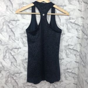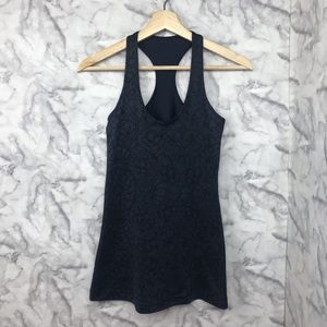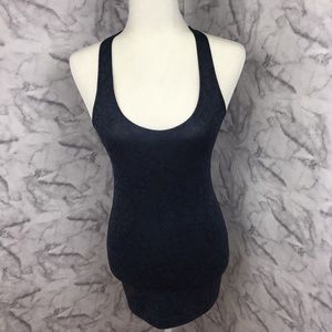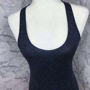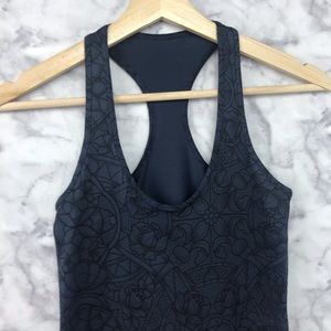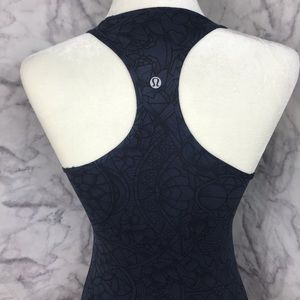 Super cool tattoo style print cool racerback tank by lululemon. Dark blue with black print. Stretchy material No size tag. Approximately 13” armpit to armpit and 26” long. Gently preowned, in excellent condition. Fits like a 4/6.