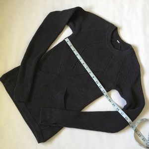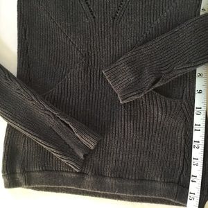 Lululemon dark grey heather 100% cotton crewneck sweater; size 2. Has 2 pockets in front and thumb holes on sleeves. Perfect this time of year! Great condition; no stains or snags.