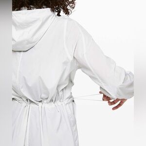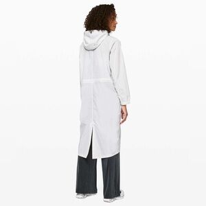 lululemon lab creates lifestyle essentials for the modern wardrobe. slip on this breezy, mid length shell when you're exploring new corners of your favorite city. translucent fabric is water repellent. features: cinchable hood, hand pockets with a hidden media pocket, drawcord waist.