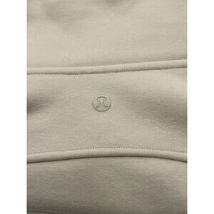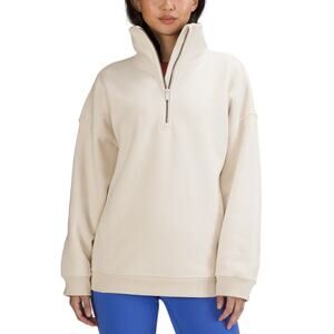 Lululemon 'Thick' Cream Polyester Fleece Half-Zip Size XS/S: oversized fit, bum-covering length, an exaggerated fit, front pockets with an interior media pocket, high neck, zipper garage, cozy and stretchy, two-sided fabric is soft and smooth on the outside and plushy fleece on the inside, heavy weight, measurements: 22.5 inch bust x 26 inch length.