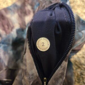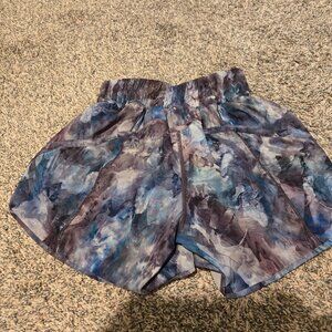 Lululemon Track That shorts. These are in the Chromasphere Multi print and a size 2. They measure as follows: waist-24 inches, hips-28 inches, rise-8 inches, and inseam-5 inches.