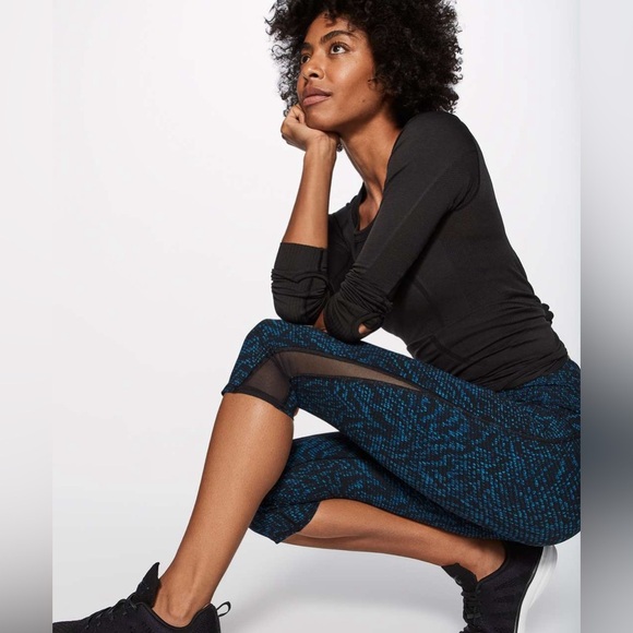 Elevate your activewear game with these eye-catching Lululemon capri leggings. Featuring bold blue print accents and breathable mesh panels, they strike the perfect balance between performance and style. Ideal for high-energy workouts or athleisure comfort.