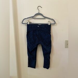 Lululemon capri leggings, mesh panel leggings, size 6 Lululemon, blue print activewear, workout tights, leisurewear, athleisure, breathable mesh, yoga pants, high-quality leggings