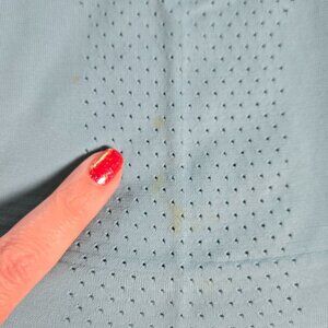 Good pre-owned condition. Does have about a half dozen small spots/stains on fabric. I have not tried to stain treat them so unsure what they are and iff they will come out. There is one on the upper front and the other few are near the hem on the the front side. See photos for what they look like.