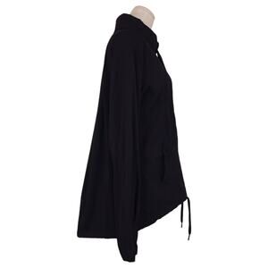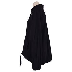 Lululemon Transition Jacket in black. Size 8. Made from the same lightweight Swift fabric as the Dance Studio Pants, this windbreaker jacket features a subtle stripe textured pattern, full-zip front, loose trapeze/swing shape, wide drawstring ties at neck and hem, longer length in back makes this great for cycling, 2 zippered hand pockets with ruffle detail, pleated back, 4-way stretch, sweat-wicking and quick-drying fabric.