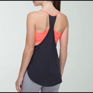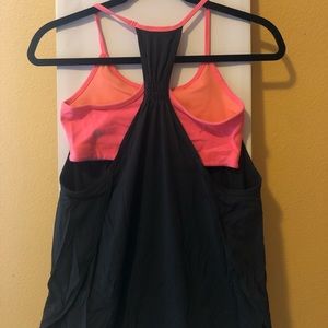 Lululemon built in bra tank in excellent condition. Worn only a couple of times. Bra is bring neon coral, and body is a light off black.