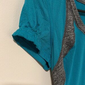 Lululemon Turquoise Gray Drawstring Ruched Short Sleeve Workout Top Size 2.