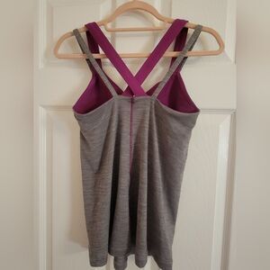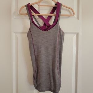Lululemon Two in One Tank , Size 6, Beautiful Grey & Purple Color in Excellent like new Conditon. Absolutely gorgeous. Pads not included.