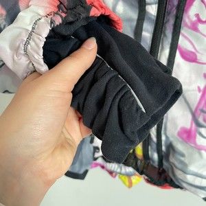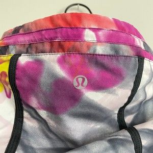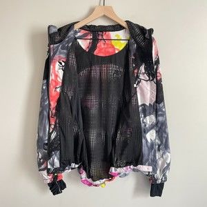 Excellent pre-owned condition (EUC). Shows light signs of wear with no notable flaws. Minor pilling on cuffs, but barely noticeable. DWR water repellent fabric, lightweight, quick drying, mesh lined zip up jacket. Has two front pockets with zippers, sleeve cuffs with thumb holes, and hood at the back. There is also a cord exit for wired headphones on the inside! Very rare, vibrant multicolor pattern. Perfect for athletes, training, athleisure, or as a bright statement piece. Please see measurements for best fit.