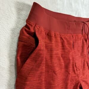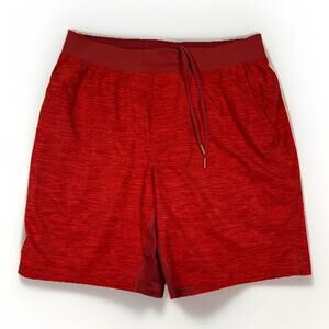 The product is a pair of Lululemon Unlined THE Short Athletic 9” Shorts in Men's Size XL, in a vibrant solar orange red color. Made from a polyester blend fabric, these shorts feature a drawstring closure, a comfortable regular fit, and a 9-inch inseam. Ideal for travel, activewear, and casual occasions, they are designed for outdoor sports and activities such as gym training, cross-training, and running. With convenient pockets and a stylish heather pattern, these athletic shorts from Lululemon are perfect for the modern man on the go.