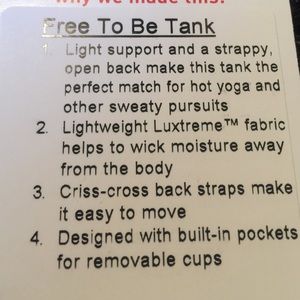 Light support and a strappy open back. Lightweight luxtreme fabric. Criss-cross back straps make it easy to move. Designed with built in pockets for removable cups. This tank is SOLD OUT in stores.
