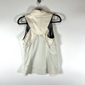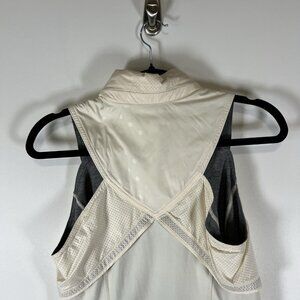 This Lululemon vest jacket is a versatile and stylish addition to any woman's wardrobe. Made from durable nylon with a blended fabric type, this mid-length jacket features a full zip closure and a packable design, making it perfect for travel and outdoor activities like running, hiking, and cross-training. The ivory color and classic athleisure style make it a timeless piece that can be worn in all seasons. With its lightweight and breathable design, this vest jacket from Lululemon offers both comfort and functionality for a variety of fitness activities.