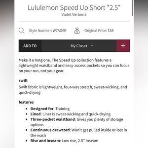Lululemon Violet Verbena Speed Up 2.5” Athletic Short Size 0