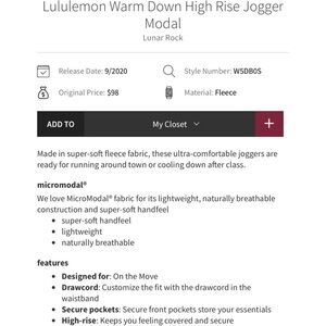 Lululemon Warm Down High Rise Jogger Modal in Lunar Rock