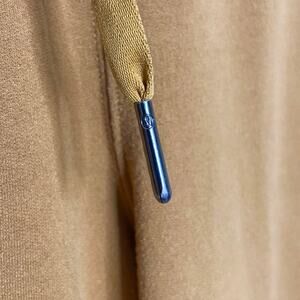 Fantastic joggers from Lululemon! Features high rise waist, stretch drawstring waist, ribbed cuffs at the ankles, full length inseam, traditional jogger style named "Warm Down", rich golden color called "Spiced Bronze", slant pockets at the hips, and mini mesh pocket inside the right pocket.