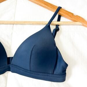Lululemon Waterside swim top in deep navy. Designed with a sleek triangle cut and adjustable straps for a customized fit. Light padding built-in for natural shaping and support. Iconic Lululemon logo featured on the band.