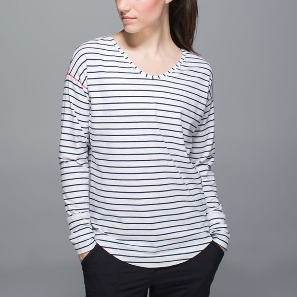 Lululemon Weekend Long Sleeve Shirt Navy Stripe Red Stitching Size 8