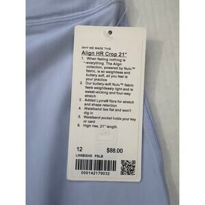 Brand new with tags Lululemon Align High Rise Crop 21" Inseam. Women’s size 12. Nylon and Lycra fabric blend. Pastel Light blue color.