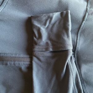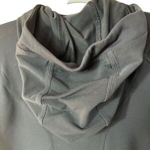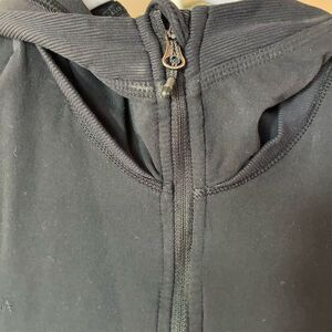 Keywords: lululemon, pullover, hoodie, black, women's activewear, breathable fabric, half zip, hooded, pockets, all seasons, medium, casual, workout, machine washable, pre-owned.