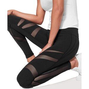 These Lululemon leggings boast a sleek, high-waisted design with mesh panel detailing, providing both style and enhanced breathability. Crafted from a blend of nylon and elastane, they offer a comfortable and flexible fit, ideal for yoga or casual wear. The black color ensures versatility, complementing a variety of tops and footwear, while the thoughtful mesh inserts add a touch of sophistication to the overall aesthetic.