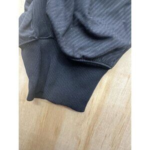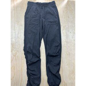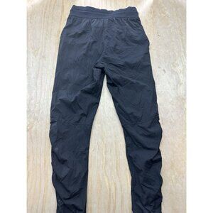 The product is a pair of Lululemon Women's Dance Studio Mid-Rise Black Joggers in size 6 with stripes. These joggers feature a tapered leg style, athletic fit, and are specifically designed for dance activities. They have an elastic waist with a drawstring closure, comfortable fabric, and pockets for convenience. The black color and athleisure theme make these joggers versatile for various activewear occasions. Couple minor blemishes that may wash out. Good stretch in waist