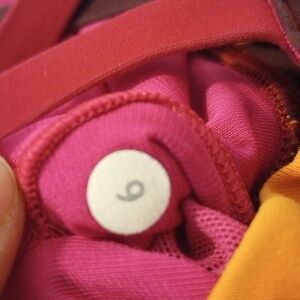 This is a pink, purple, and orange color block Lululemon Energy Sports Bra in a size 6. It does not have padding. It has a few spots were the stitching has come loose.