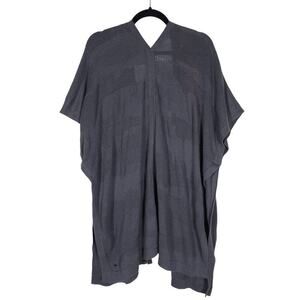 Dark gray open-front knit cardigan made from a soft and breathable blend of 55% cotton, 40% polyester, and 5% silk, featuring a relaxed, draped silhouette. This cardigan showcases subtle textured patterns throughout, adding depth and style. Designed by Lululemon in a one-size fit, it offers a versatile layering option for any casual or athleisure wardrobe. In gently pre-owned condition.
